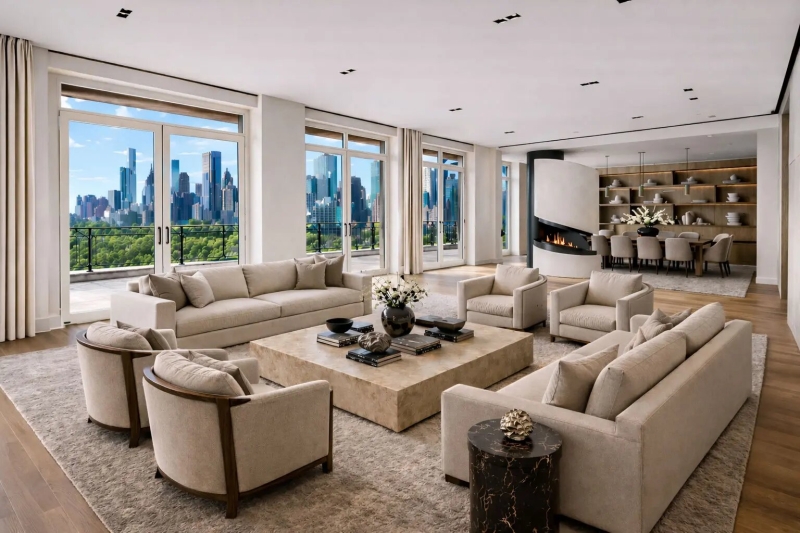 Квартира площадью 500 кв. метров находится в секции House башни и имеет более 13 метров фасада с видом на Центральный парк. В доме три спальни и большой домашний офис, который можно использовать как четвёртую спальню. Просторное жильё включает в себя полуприватную лестничную площадку с лифтом и большой холл, в котором легко могут разместиться более 100 человек, ожидающих коктейли.