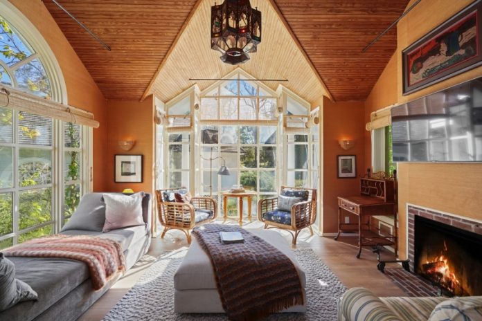 Среди наиболее впечатляющих особенностей здания — огромная гостиная с потолком высотой 9 метров, а также просторная главная спальня с гостиной, балконом, огромной гардеробной и двумя ванными комнатами. Кроме большого главного дома на территории поместья площадью 12 акров есть домик у бассейна, отдельный гостевой коттедж и сад полевых цветов.